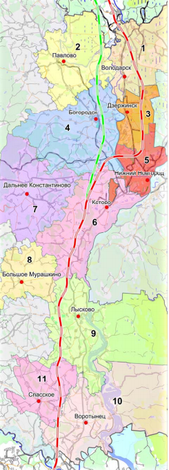 Если будет утвержден первый вариант, то высокоскоростная магистраль пройдет по территории следующих муниципальных районов и городских округов Нижегородской области: Володарский район, Дзержинск, Богородский район, Нижний Новгород, Кстовский, Лысковский, Спасский и Воротынский.